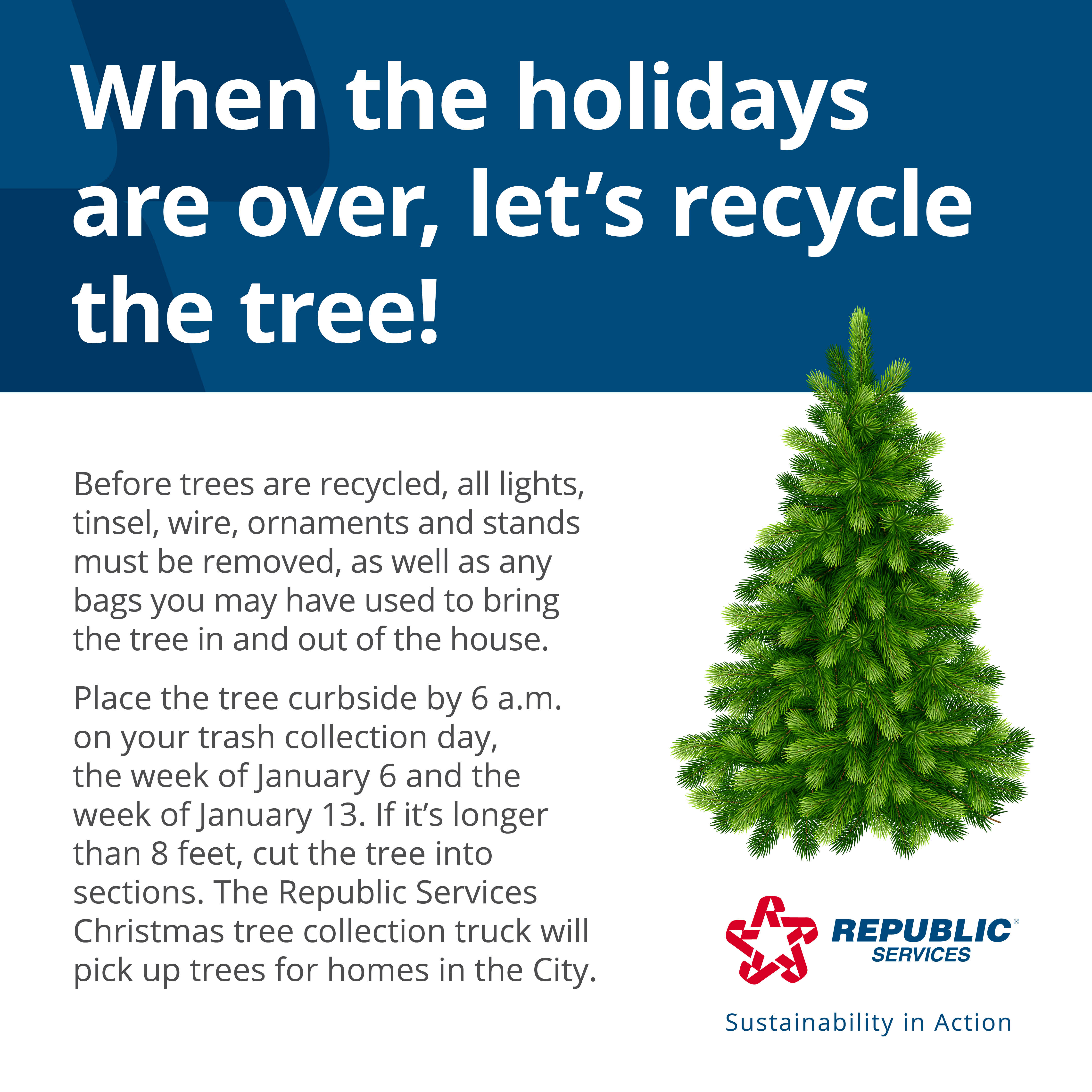 The Republic Services Christmas tree collection truck will pick up trees for homes in the City of Excelsior on your trash collection day, the week of January 6 and the week of January 13.